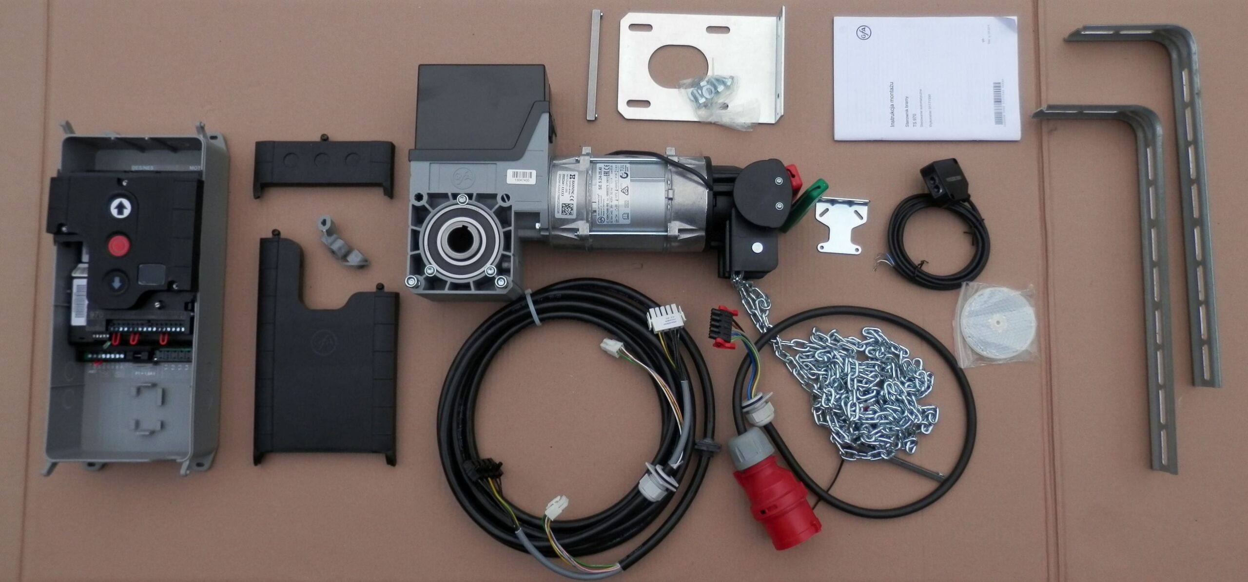 Uwaga: w zestawie łańcuch awaryjnego otwierania długości 4m.b. (łańcuch tworzy pętle o długości 2m, co pozwala na obsługę bramy, której wał jest na maksymalnej wysokości około 3,5m) Potrzebujesz dłuższy łańcuch? – skontaktuj się, istnieje możliwość dokupienia 30zł za 1m.b.