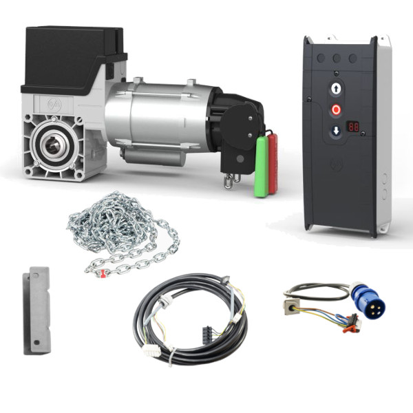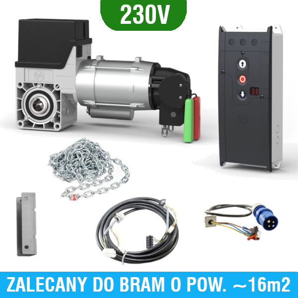 Zestaw automatyki do bram segmentowych garażowych i przemysłowych, renomowanej niemieckiej firmy GFA ELEKTROMATEN. Zalecany do bram o maksymalnej powierzchni 16m2. W zestawie znajduje się: napęd do bramy GFA SE 5.24WS-24,50, centrala TS970 służąca do sterowania napędem, mechanizm awaryjnej obsługi ręcznej  pozwalający otworzyć/zamknąć bramę w przypadku braku prądu, przewody połączeniowe, elementy montażowe, instrukcja.  Napęd przystosowany jest do wału o średnicy 25,4mm (1″). Zestaw zasilany jest napięciem 230V.