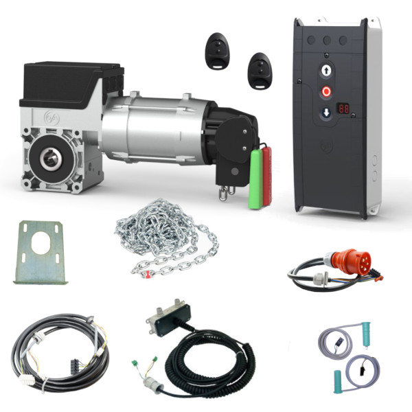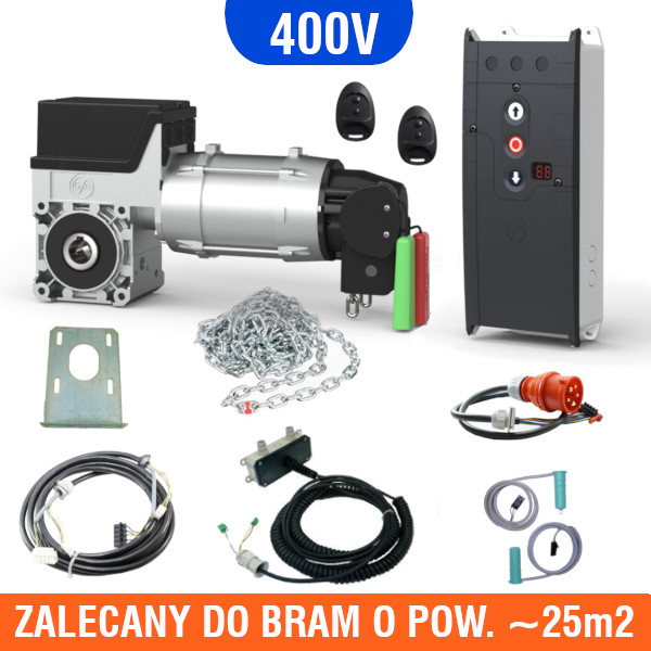 Kompletny zestaw automatyki do bram segmentowych, renomowanej firmy GFA ELEKTROMATEN. Zalecany do bram o maksymalnej powierzchni 25m2. W zestawie znajduje się: napęd do bramy GFA SE 9.24-25,40, centrala TS971 służąca do sterowania napędem, mechanizm awaryjnej obsługi ręcznej pozwalający otworzyć/zamknąć bramę w przypadku braku prądu, zestaw fotokomórek z okablowaniem zabezpieczający przed zgnieceniem obiektu znajdującego się w świetle bramy (OSE), dwa piloty, przewody połączeniowe, elementy montażowe, instrukcja. Napęd przystosowany jest do wału o średnicy 25,4mm (1″). Zestaw zasilany jest napięciem 3N~400V.