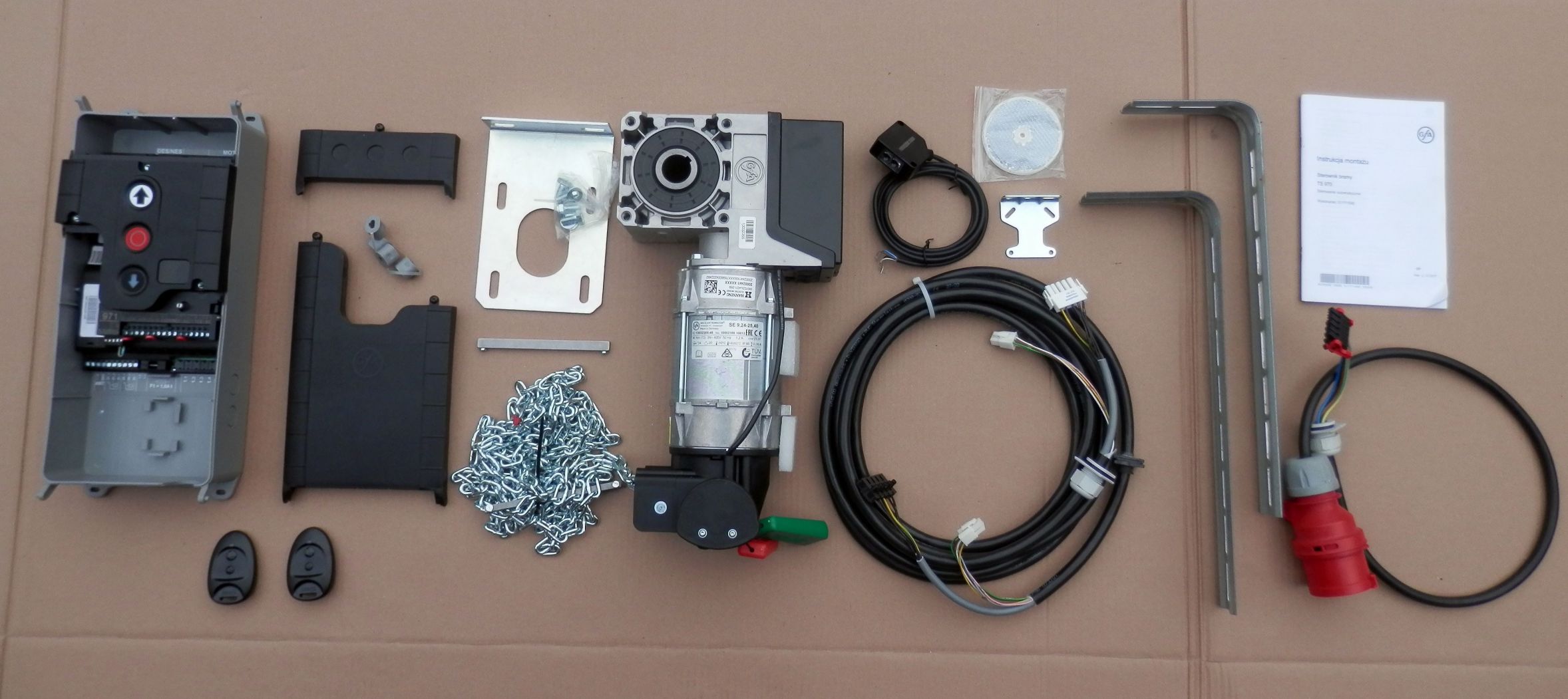 Uwaga: w zestawie łańcuch awaryjnego otwierania długości 4m.b. (łańcuch tworzy pętle o długości 2m, co pozwala na obsługę bramy, której wał jest na maksymalnej wysokości około 3,5m) Potrzebujesz dłuższy łańcuch? – skontaktuj się, istnieje możliwość dokupienia 30zł za 1m.b.