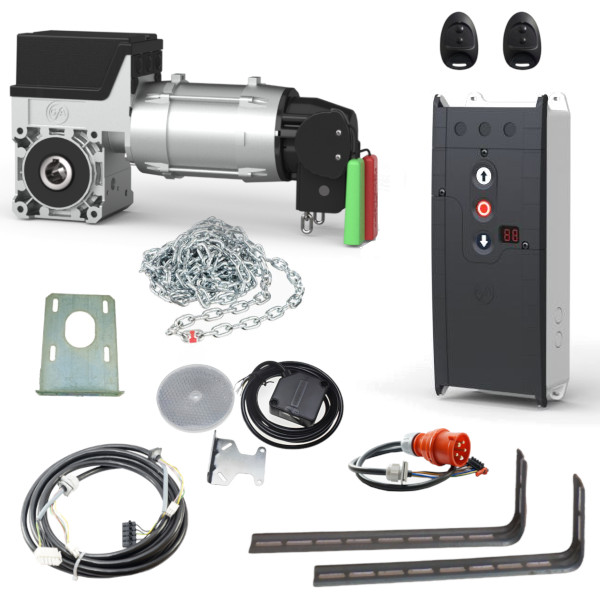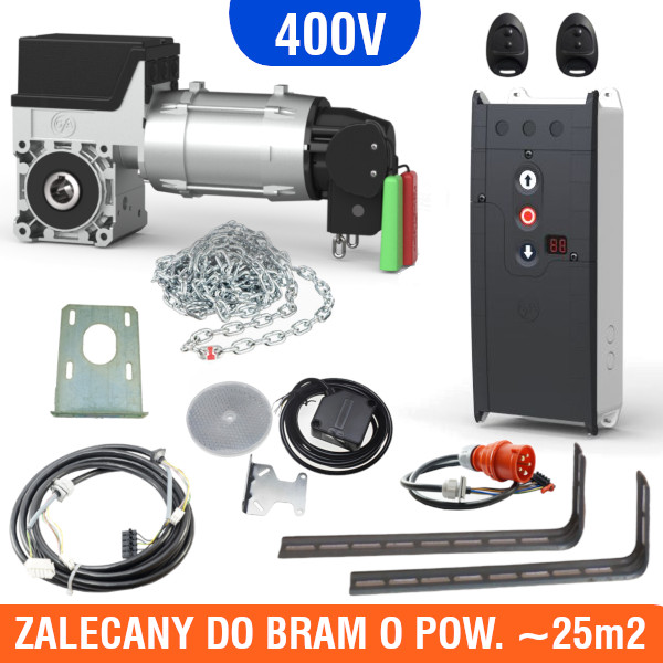 Kompletny zestaw automatyki do bram segmentowych, renomowanej firmy GFA ELEKTROMATEN. Zalecany do bram o maksymalnej powierzchni 25m2. W zestawie znajduje się: napęd do bramy GFA SE 9.24-25,40, centrala TS971 służąca do sterowania napędem, 2 piloty, mechanizm awaryjnej obsługi ręcznej pozwalający otworzyć/zamknąć bramę w przypadku braku prądu, fotokomórka refleksyjna montowana w świetle bramy, przewody połączeniowe, elementy montażowe, instrukcja. Napęd przystosowany jest do wału o średnicy 25,4mm (1″). Zestaw zasilany jest napięciem 3N~400V.