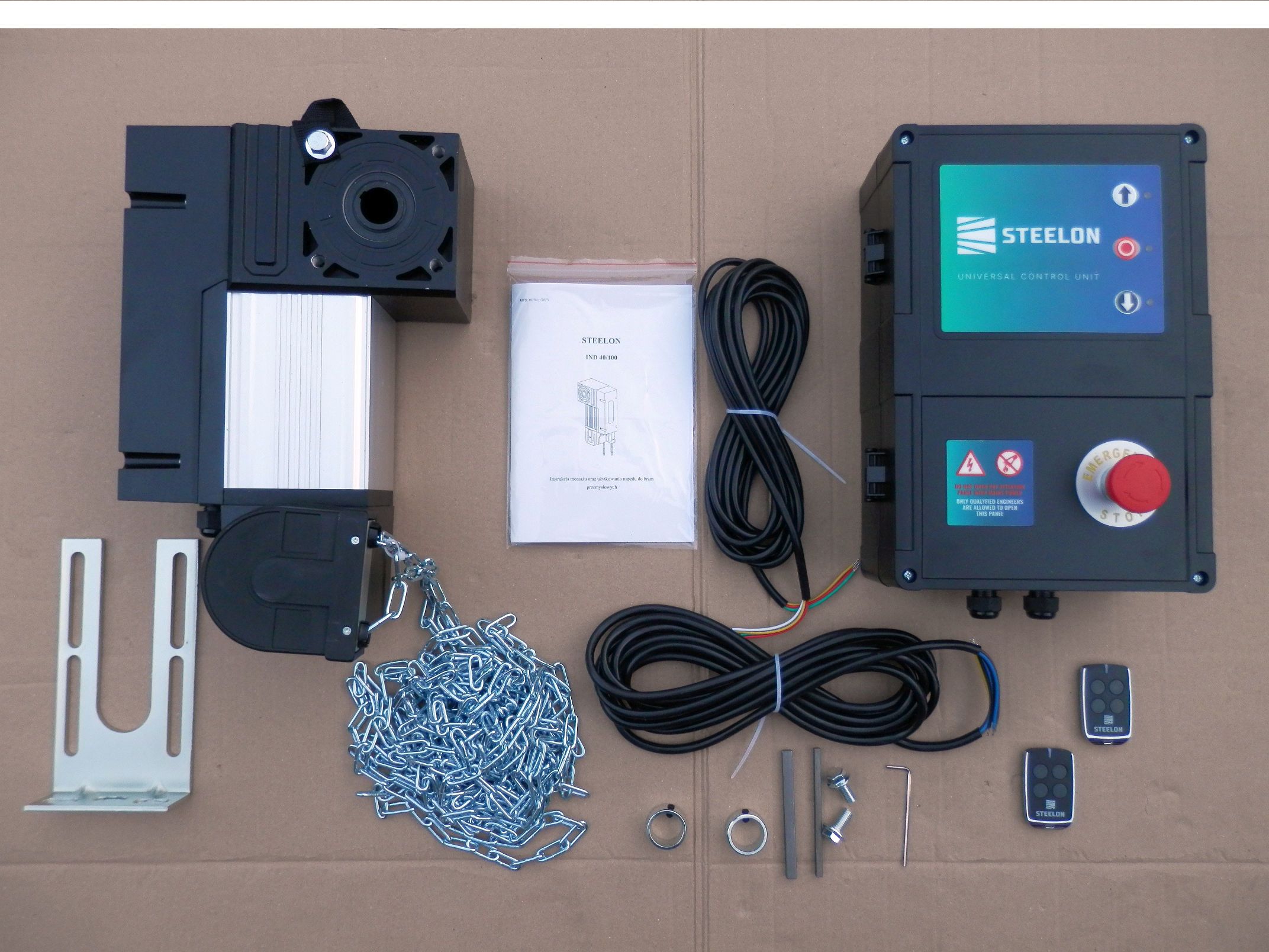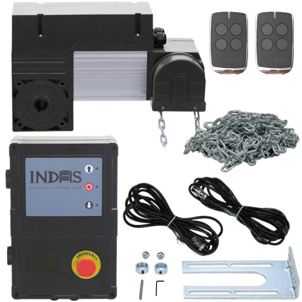 Zestaw automatyki INDUS 40 do bram segmentowych przemysłowych i garażowych zasilany napięciem 230V. W zestawie znajduje się: napęd do bramy INDUS 40, centrala, mechanizm awaryjnej obsługi ręcznej pozwalający za pomocą łańcucha otworzyć/zamknąć bramę w przypadku braku prądu, przewody połączeniowe, elementy montażowe, 2 piloty, instrukcja. Napęd przystosowany jest do wału o średnicy 25,4mm (1″).