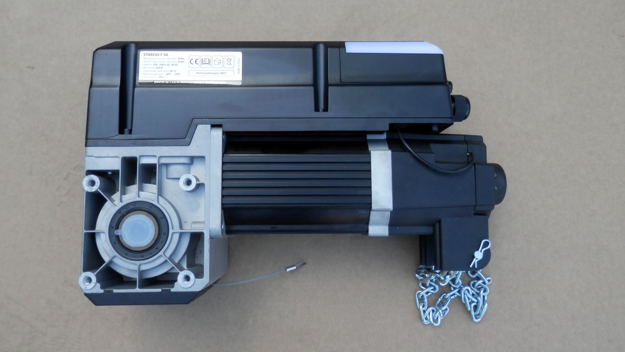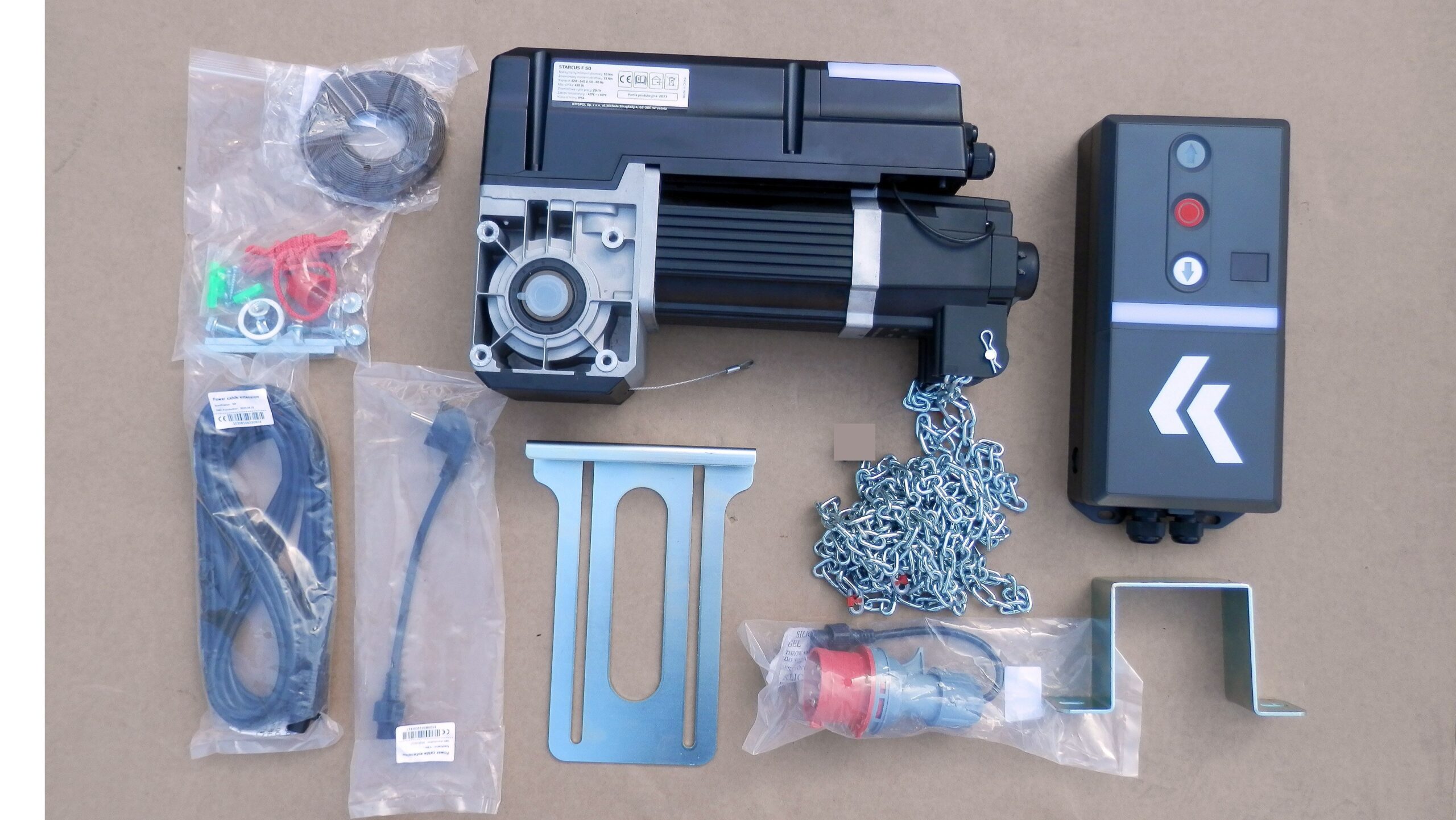 Zestaw automatyki do bram segmentowych przemysłowych bądź garażowych: napęd KRISPOL STARCUS F50, centrala, przewody, łańcuch, elementy montażowe.  Wyposażony w funkcję łagodny start i stop, przystosowany do wału o średnicy 25,40mm. Zestaw zasilany napięciem 230V – możliwość podpięcia do sieci 400V za pomocą dostarczonego w zestawie adaptera.