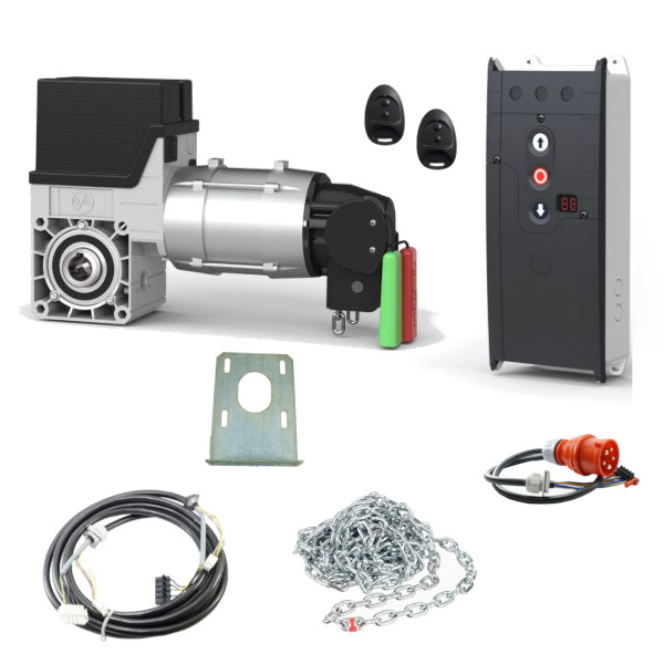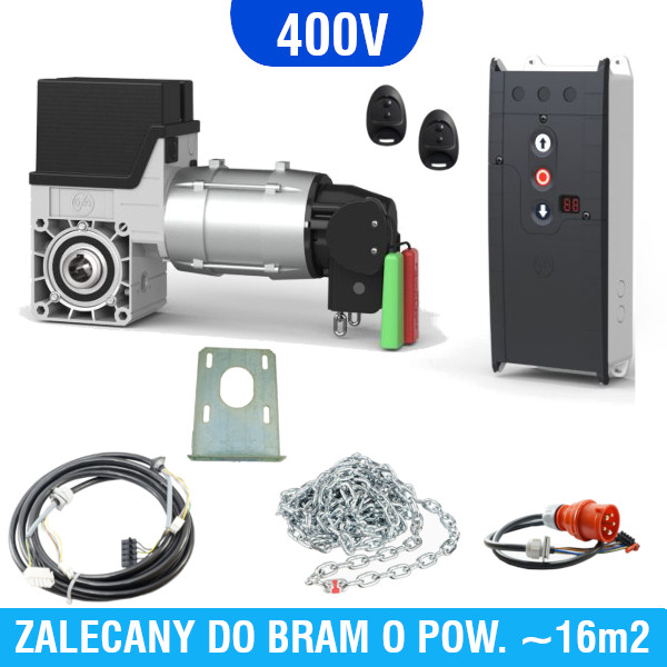 Kompletny zestaw automatyki do bram segmentowych garażowych i przemysłowych, renomowanej firmy GFA ELEKTROMATEN. Zalecany do bram o maksymalnej powierzchni 16m2. W zestawie znajduje się: napęd do bramy GFA SE 5.24-24,50, centrala TS971 służąca do sterowania napędem, mechanizm awaryjnej obsługi ręcznej pozwalający otworzyć/zamknąć bramę w przypadku braku prądu, , 2 piloty, przewody połączeniowe, elementy montażowe, instrukcja. Napęd przystosowany jest do wału o średnicy 25,4mm (1″). Zestaw zasilany jest napięciem 3N~400V.