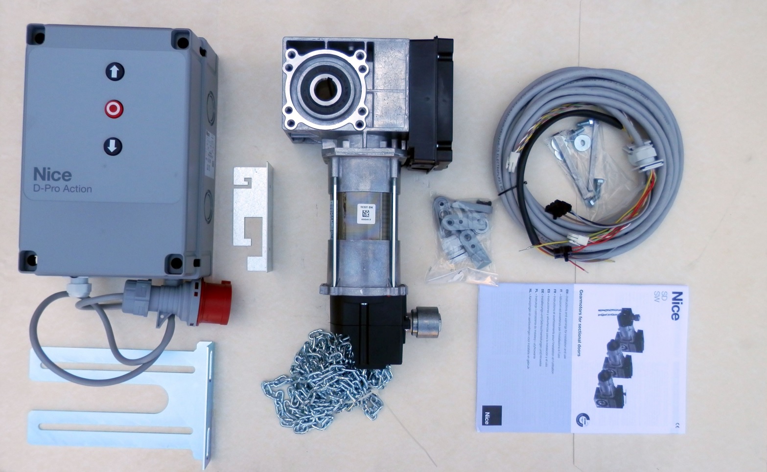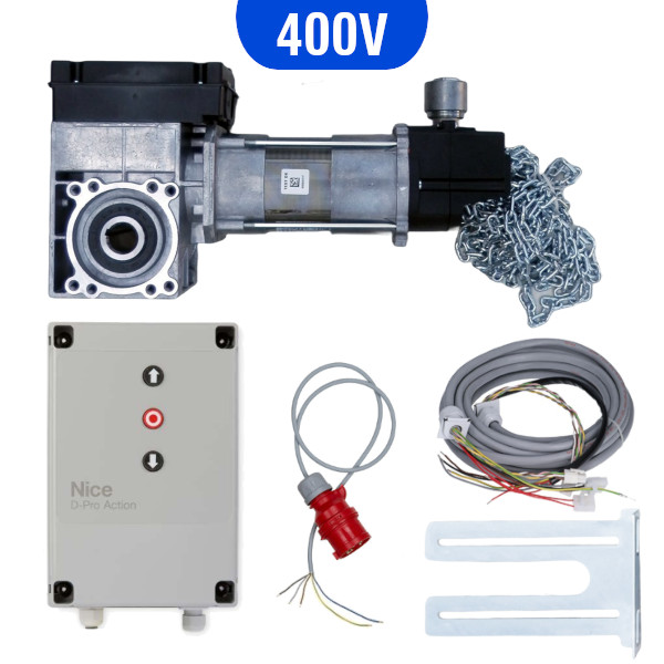 Zestaw automatyki do bramy segmentowej przemysłowej NICE SD 100-24 EL15 KE Z100 NDCM0199. W skład zestawu wchodzi: napęd, centrala, przewody, elementy montażowe, stalowa podpora, awaryjny napęd z łańcuchem do obsługi ręcznej, instrukcja. Siłownik wyposażony jest w elektroniczny wyłącznik krańcowy, co sprawia, że programowanie, regulacje i ustawienia położeń krańcowych dokonujemy z poziomu centrali. Możliwość wpięcia odbiornika radiowego OXIBD.