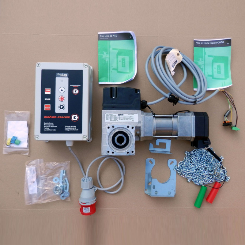 Zestaw automatyki do bram segmentowych, holenderskiej firmy PRO LINE SYSTEM. Zalecany do bram o maksymalnej powierzchni 25m2. W zestawie znajduje się: napęd do bramy, centrala V7E służąca do sterowania napędem, mechanizm awaryjnej obsługi ręcznej pozwalający za pomocą łańcucha otworzyć/zamknąć bramę w przypadku braku prądu, przewody połączeniowe, elementy montażowe. Napęd przystosowany jest do wału o średnicy 25,4mm (1″). Zestaw zasilany jest napięciem 3N~400V.