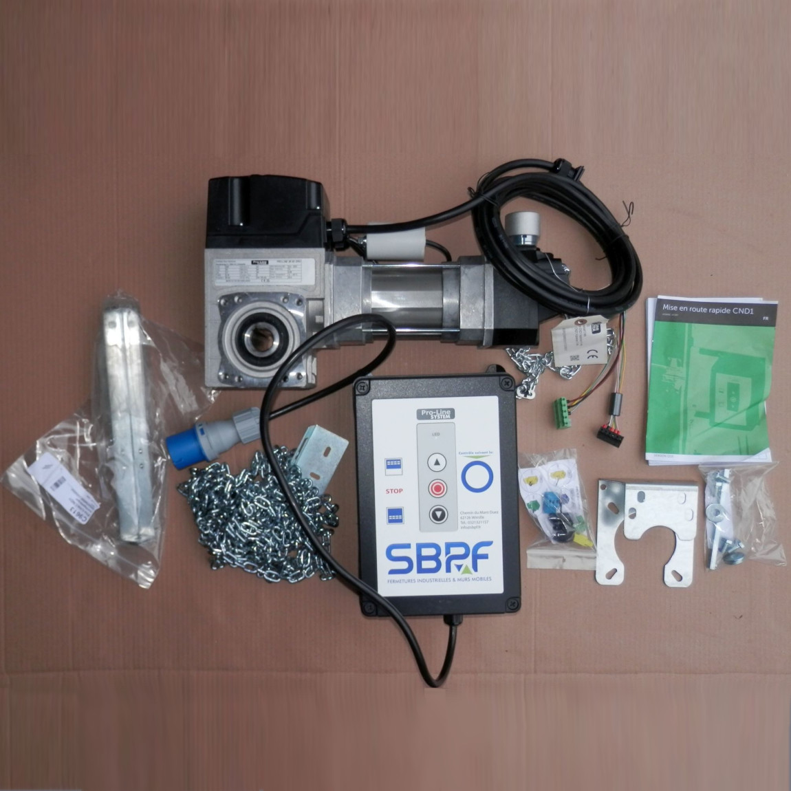 Zestaw automatyki do bram segmentowych, holenderskiej firmy PRO LINE SYSTEM. Zalecany do bram o maksymalnej powierzchni 16m2. W zestawie znajduje się: napęd do bramy, centrala V7E służąca do sterowania napędem, mechanizm awaryjnej obsługi ręcznej pozwalający za pomocą łańcucha otworzyć/zamknąć bramę w przypadku braku prądu, przewody połączeniowe, elementy montażowe. Napęd przystosowany jest do wału o średnicy 25,4mm (1″). Zestaw zasilany jest napięciem 230V.